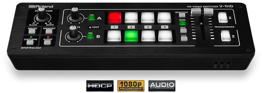 De Roland V1HD videomixer is een ultra-compacte mixer (slechts 1,2 kg) welke maximaal 4 HDMI-bronnen kan schakelen. Ondanks zijn compacte formaat heeft de mixer professionele functies zoals een aparte output voor een preview-monitor, ondersteuning van HDCP (dus geen problemen met beveiligde DVD’s b.v.), een ingebouwde audiomixer (met delay om beeld/geluid synchroon te regelen).